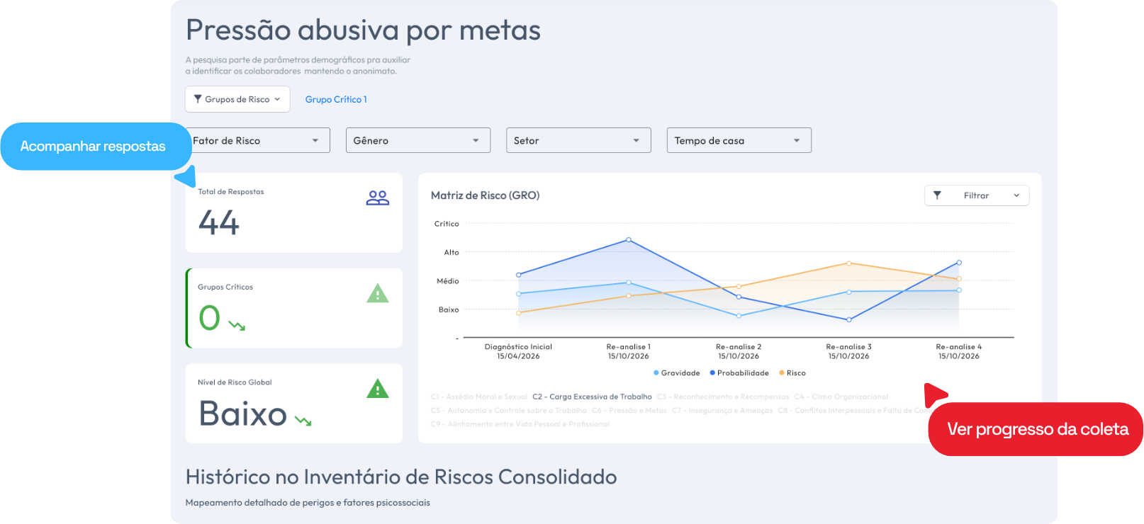 Alinhado ao Gerenciamento de Riscos Ocupacionais (GRO), com avaliação, classificação, priorização e tratamento dos riscos psicossociais conforme a NR-1 e NR-17.
