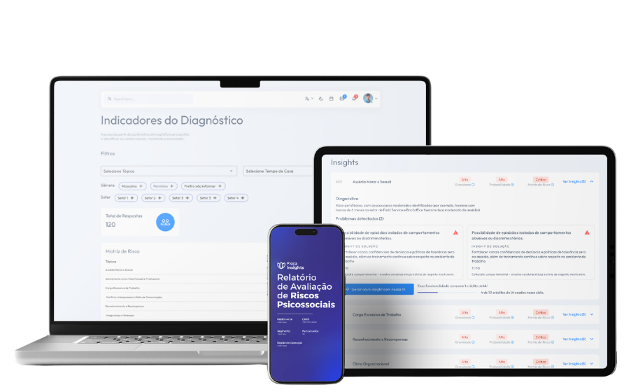 Pesquisas de clima medem percepção geral. A Flora Insights realiza um diagnóstico técnico e clínico de riscos psicossociais, identificando gravidade, probabilidade e impacto real. O foco não é opinião, é prevenção estratégica e tomada de decisão baseada em evidências.